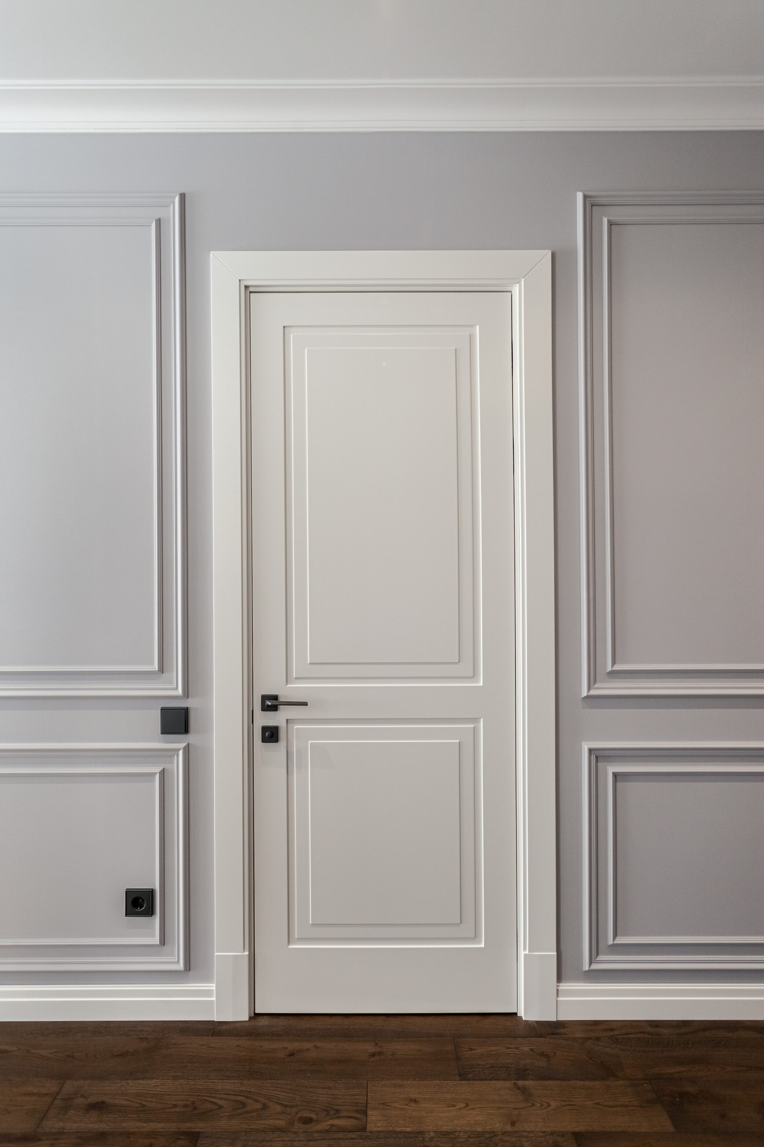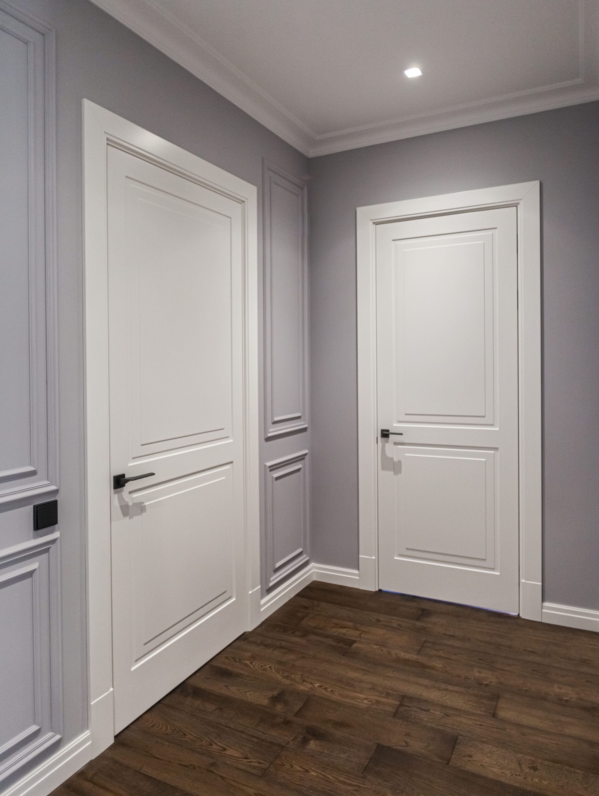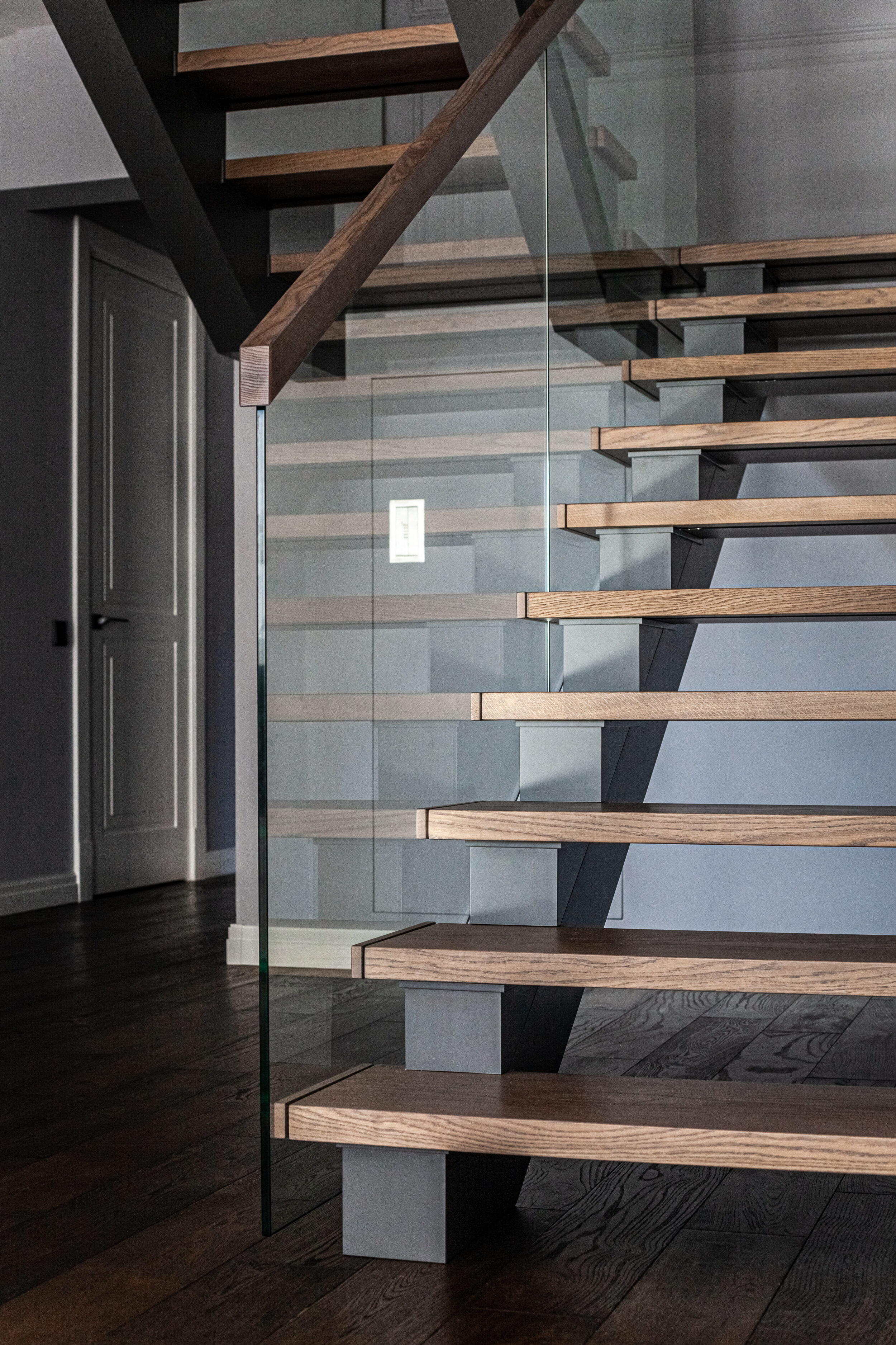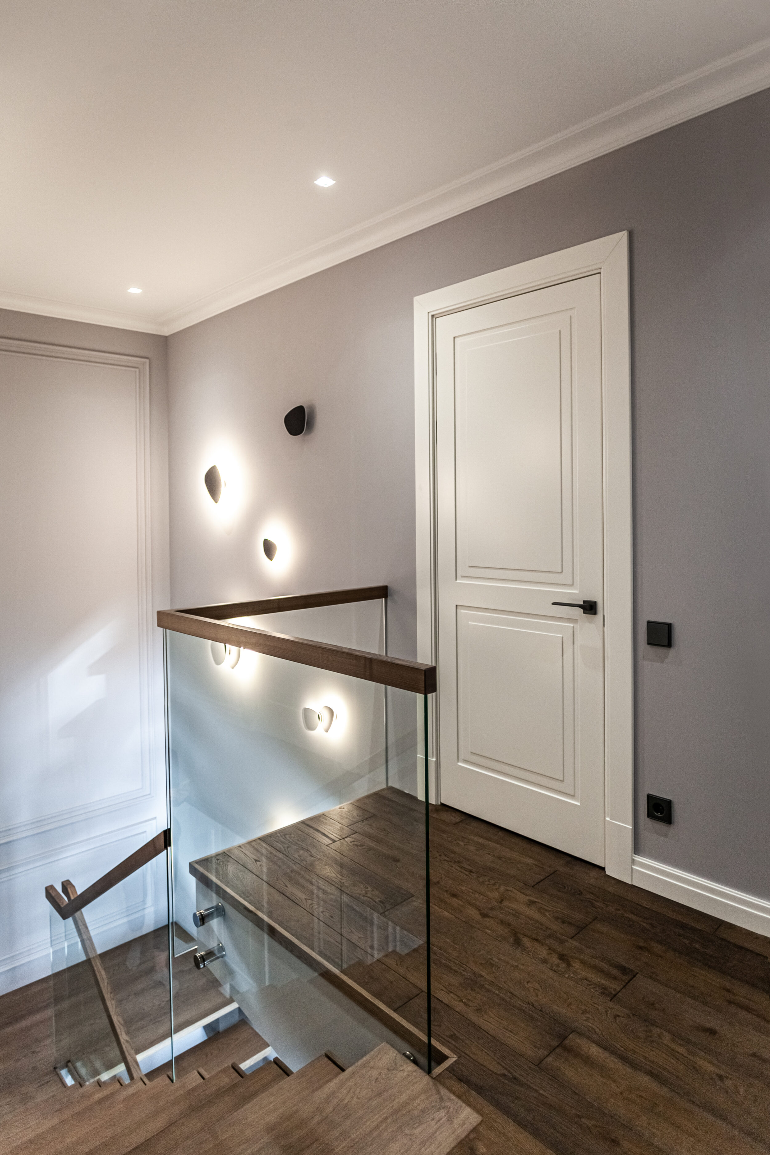 Для данного проекта Компания Qualita изготавливала входной блок, межкомнатные двери, лестницу, плинтус.